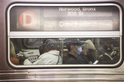 4日,在美国纽约,部分乘客戴口罩乘坐地铁。