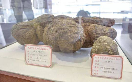 例如道地药材茯苓,呈类球形、椭圆形、扁圆形或不规则团块,大小不一。外皮薄而粗糙,棕褐色至黑褐色,有明显的皱缩纹理。味甘、淡,性平。