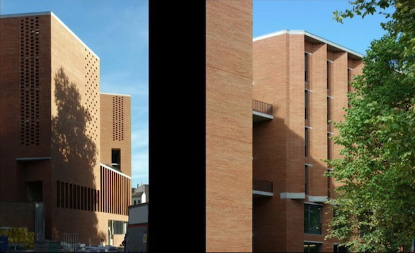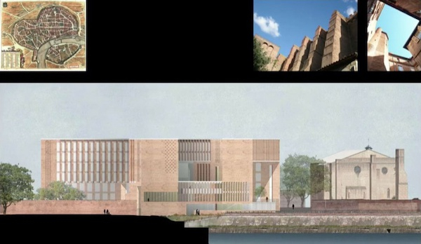 最后一个介绍的项目是图卢兹第一大学经济学院。图卢兹是一座充满历史碎片的城市,也是一座风景如画的红砖之城,这里有一条大河,漂亮的砖墙,美丽的教堂。项目处在一个很棒的位置,在一段中世纪城墙的缺口中。
