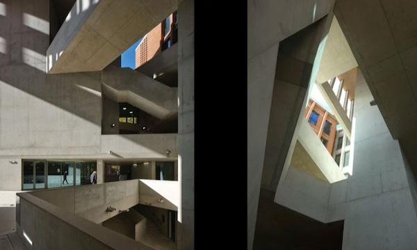 这个项目的自由空间是这个大学设计的长条形的市民空间。所以整条路上不仅有这个学校,还有一条长200米的景观。这片区域笼统地能被区分为两或三种用途,一条喧闹,一条安静,喧闹的路上有舞蹈和表演馆,另一条是图书馆,我们认为这种相近的关系创造了一个无比丰富的空间。我们有一系列的理由来确认这种关系,但是张照片展示了,即使两幢楼近乎对立的关系,图书馆带有欢迎的气质,它是多孔的,且不在入口设置任何障碍,这对于图书馆而言是很好的事情,因为无论是大学还是公共图书馆,它是我们社会上最民主的机构。而且图书馆员非常民主和开放地向我们无条件提供获取知识的途径,对于建筑师来说是一件很棒的事情。