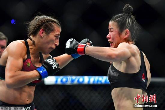 北京时间3月8日,中国首位UFC冠军张伟丽在美国拉斯韦加斯举行的UFC248站女子草量级世界冠军卫冕战上,在五个回合里以点胜击败波兰选手乔安娜,成功卫冕。去年8月,张伟丽在深圳用时不到1分钟就KO了现役王者安德拉德,创造了中国格斗历史。图为张伟丽(右)在卫冕战比赛中。