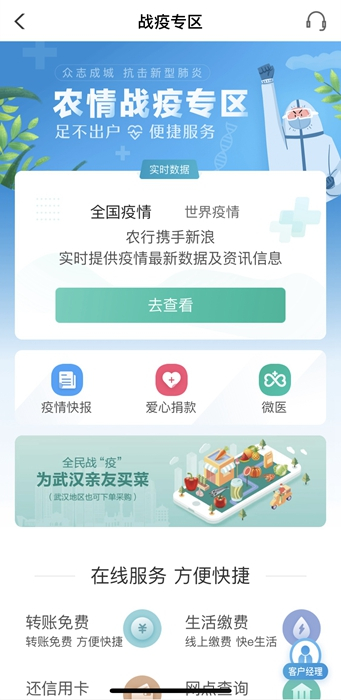 推出多项线上专属服务。在农行掌上银行推出“农情战疫专区”,实时提供疫情最新数据及资讯信息,上线“微医互联网医院”在线诊疗平台,实现农行客户对接全国46000多名呼吸、感染和内科专家的线上问诊服务,已提供超过158万例咨询,减少了医院就诊的交叉感染机率。联合商家与物流,开通面向武汉地区的送菜服务,掌银下单,高效送达,减少人员聚集,保障武汉居民充足的生鲜物资。