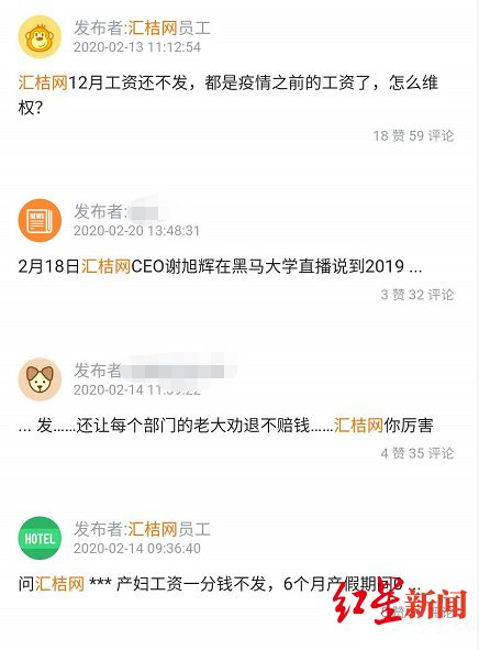 此外,记者注意到,职场社交平台“脉脉”及微博上多位汇桔网员工称,“公司拖欠去年12月工资至今,且正在优化人员”。该公司一位在职员工向红星新闻记者证实了这种说法。