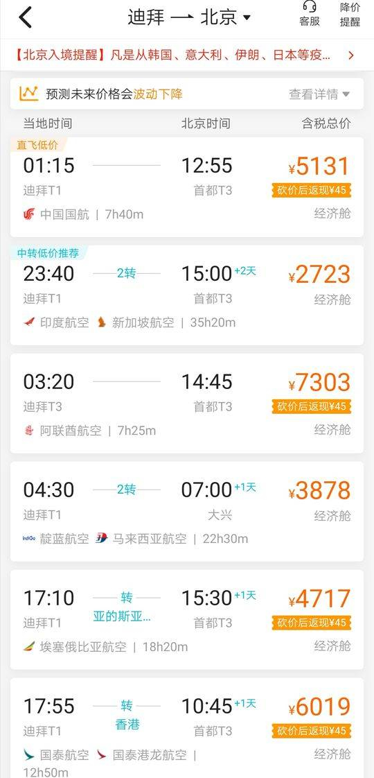 网传迪拜飞北京机票价格