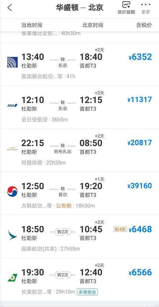 同时,记者查阅了从华盛顿飞北京的航班,发现不同订票软件差异较大,以携程为例,近期从华盛顿杜勒斯国际机场飞北京的价格从几千到2万元不等,而在去哪儿网上,价格则从几千到7万多元不等。