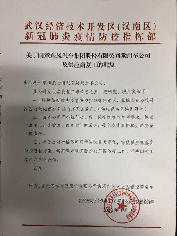 3月9日,武汉经济技术开发区(汉南区)新冠疫情防控指挥部下发《关于同意东风集团乘用车公司及供应商复工的批复》,批准东风乘用车公司及辖区内供应商分阶段有序开工复产。相关文件还显示,东风本田及供应商复工申请也获得了批复。