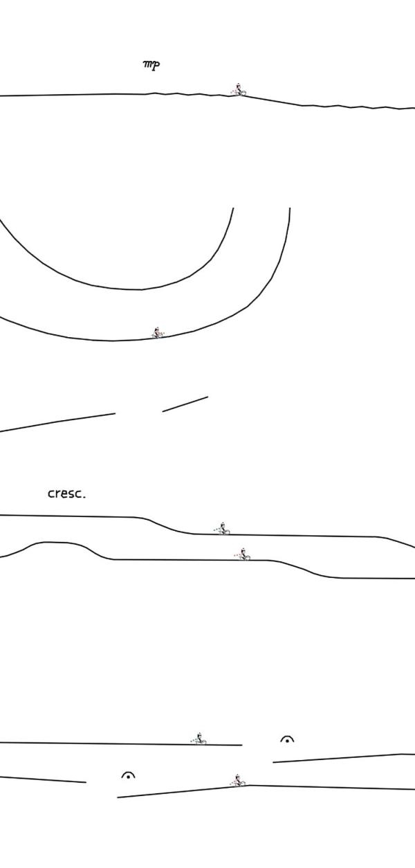 在中国网友看来,这个线条小人就像外卖小哥骑着摩托送餐,一路颠簸,最终抵达终点。在这个过程中,观众也跟着小哥翻山越岭、迎风破浪、摇头晃脑,途中免不了经受种种打击,但人的命运不就是这样跌宕起伏?这不就是“命运”交响曲的真谛?