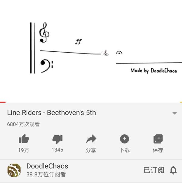2011年至今,Doodle Chaos在YouTube发布了近100条视频,都和动态艺术相关。2017年,他开始上传线条小人视频,虽然只有9个作品,但点击量都不俗,最热门的当属贝多芬《第五交响曲“命运”》——单是这一条视频,点击量就有6800多万。