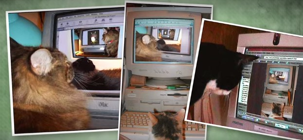 有一个游戏可以帮我们理解网红猫跟人类的互喻,2003年出现了一个叫做“无限猫”的摄影接龙网站,玩法是拍下自己的猫看着屏幕里的另一只猫在看其他猫在屏幕里……这样鸡生蛋蛋生鸡的无限循环。