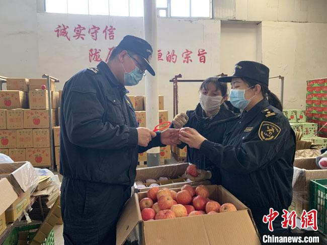 3月以来,甘肃“平凉金果”陆续出口巴林、沙特阿拉伯、阿联酋等海湾国家,持续拓展多元化出口市场。图为兰州海关工作人员抽检出口苹果品质。兰州海关供图