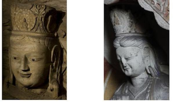 18窟主像东侧的胁侍菩萨(左) 11窟东壁中部盝形龛交脚弥勒(右)
