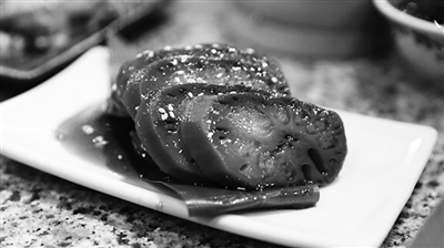 再一道蜜汁藕。甜汁稠度适宜,夹起一块正好有“拔丝”的效果。藕孔里的糯米,为口感带来了丰富的变化。而藕本身经过长时间熬煮,几乎烧干水分,祛除了涩味和沙面感,反而弹牙。把藕做得不像藕,竟有几分“王熙凤茄鲞”的意境。