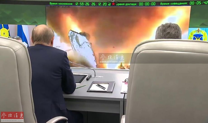 12月26日,俄罗斯总统普京来到位于莫斯科的国防指挥中心观摩试射“先锋”高超音速助推滑翔导弹(简称HGV)系统,这是该“先锋”系统在2019年投入使用前的最后一次公开试射。图为俄总统普京观摩试射“先锋”高超音速导弹。