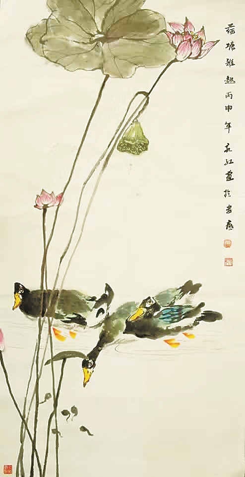 陈永红的书画作品乡土气息扑面而来,画中花鸟虫鱼,一样憨态可掬,却又不乏清新灵动。曾国藩故居富厚堂前的那片荷海,亭亭玉立的荷花、碧绿如油的荷叶以及在荷杆小憩的蜻蜓、雏鸟,荷叶下憩息觅食的鸭子和游鱼,出淤泥而不染的每一朵荷花,在陈永红的描绘下多姿多彩。