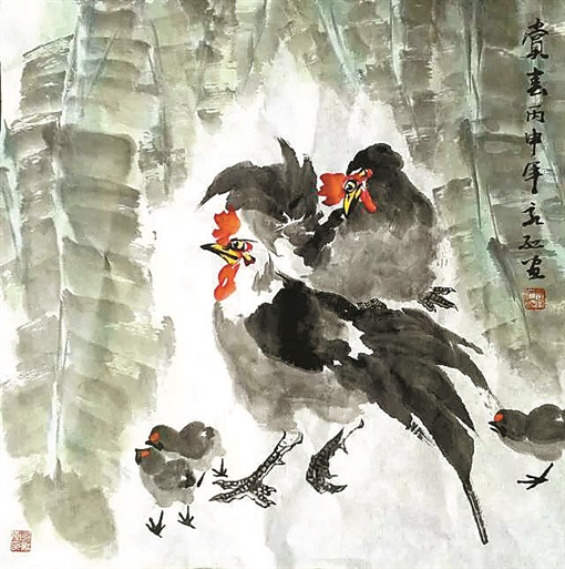 陈永红笔下的小动物,小鸡仔或结队觅食嬉戏抓虫,或依偎母亲嗷嗷待哺,都出神入化;鳜鱼或跃出水面激起涟漪朵朵,或探头探脑藏身于荷花深处若隐若现;几株淡黄秋菊下,数只雄鸡引吭高歌;庭前松枝翠叶之间,两只灵猫嬉闹追逐。这些乡村生活图画,酝酿成一笔一画的艺术灵感,形成了醇香扑鼻、厚拙生动的艺术作品。