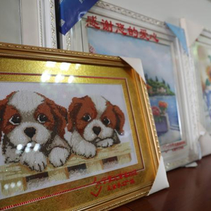 宁夏儿童福利院家庭寄养服务中心内,摆放着孩子们制作的十字绣。 杨迪 摄