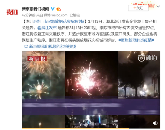 3月13日,湖北潜江发布企业复工复产相关通告。@潜江发布 通告称3月13日20时起,撤除市域内所有内设交通管控点,潜江将恢复正常交通秩序,并逐步恢复市域内客运以及渡口码头。部分企业也将恢复生产秩序。潜江市民在街头燃放烟花庆祝城市解封。