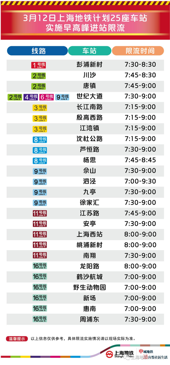 3月12日早高峰25座地铁站计划限流。上海地铁 图