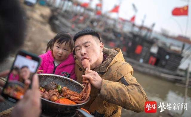 李加亮和他的女儿正在码头拍摄小视频,他和女儿一起吃八爪鱼。这位网红最近有点掉“粉”,“只有270万了”