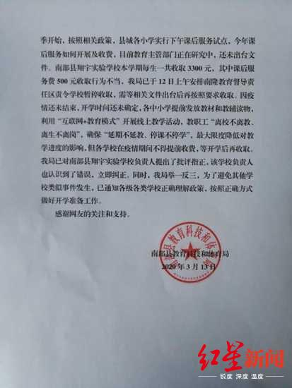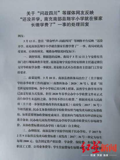 3月13日,南部县教科体局就网友反映的情况回复称,该局于3月12日上午安排有关部门进行现场调查并处置,南部县翔宇实验小学安排班主任通过微信支付等收取学杂费一事属实,其安排方式不合符教育主管部门工作安排要求。
