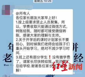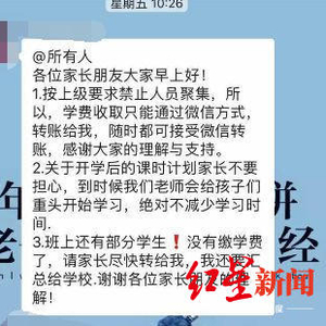 根据网友提供的疑似班级群聊天截图显示,疑似老师在群里发通知称:“按上级要求禁止人员聚集,所以,学费收取只能通过微信转账方式,转账给我……班上还有部分学生!没有缴学费了,请家长尽快转给我,我还要汇总给学校……”