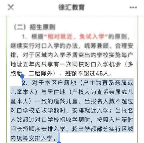 举例说明。比如徐汇区规定,对于本区入学矛盾突出的公办学校实施每户地址五年内只有一次同校对口入学机会(二孩除外),班额不超过45人。也就是说五年一户是大前提。而人户一致的排序,今年官网表述如下:对于本区户籍地(户主为直系亲属或儿童本人)与居住地(产权人为直系亲属或儿童本人)一致的适龄儿童,当报名人数不超过对口学校招收学额时,安排就近入学,当报名人数超过对口学校招收学额时,按照入户籍时间长短顺序安排入学,超出学额部分,实行区域内统筹安排入学。就是说,当报名人数超过公办学校学额时,在对口小区报户口时间越长的人能优先录取,报户口时间短的就有可能被统筹去区里别的学校。