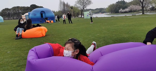 图说:市民在东方绿舟大草坪享受阳光浴