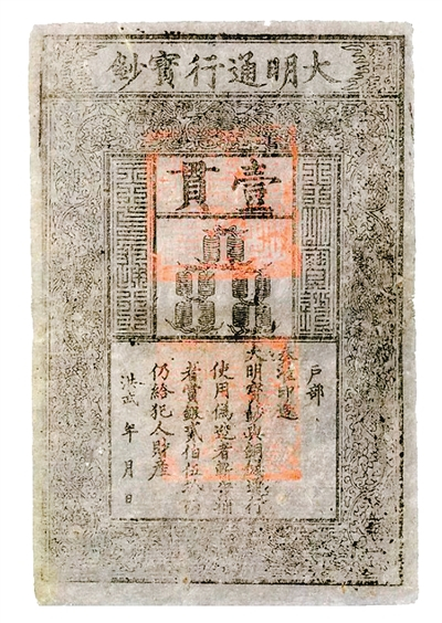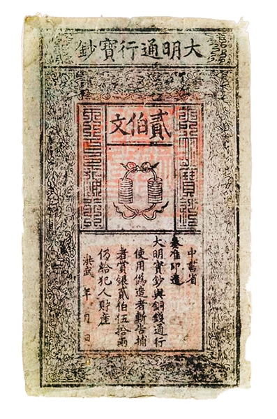 史料记载,明朝初年极度缺铜,从而导致纸币大行其道,市场一度达到“用钞不用钱”的地步。据《明史·食货志》记载,明太祖朱元璋在洪武七年设立了宝钞提举司,为明朝金融主管部门;次年,明政府开始印制发行纸币,命名为“大明宝钞”,于民间通行。