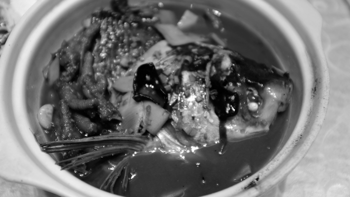 我从未见过这么大的白水鱼,或许是太湖水深的关系,上海的菜场里见不着这种个头的。砂锅里炖着甲鱼,也是季节时令,所谓菜花甲鱼,就是油菜花时节,甲鱼经过冬眠苏醒,最是鲜美。
