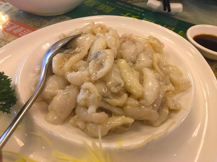菜端上桌,看上去量也不多。苏州人就是秀气,以前吃凸黄油,也是小小的一小盅,如今糟熘塘鱼片,又是小小一碟,不过,量小却都是精华萃取,一小盅凸黄油要四五只蟹,眼前这一碟也得用上十来条塘鳢鱼吧。