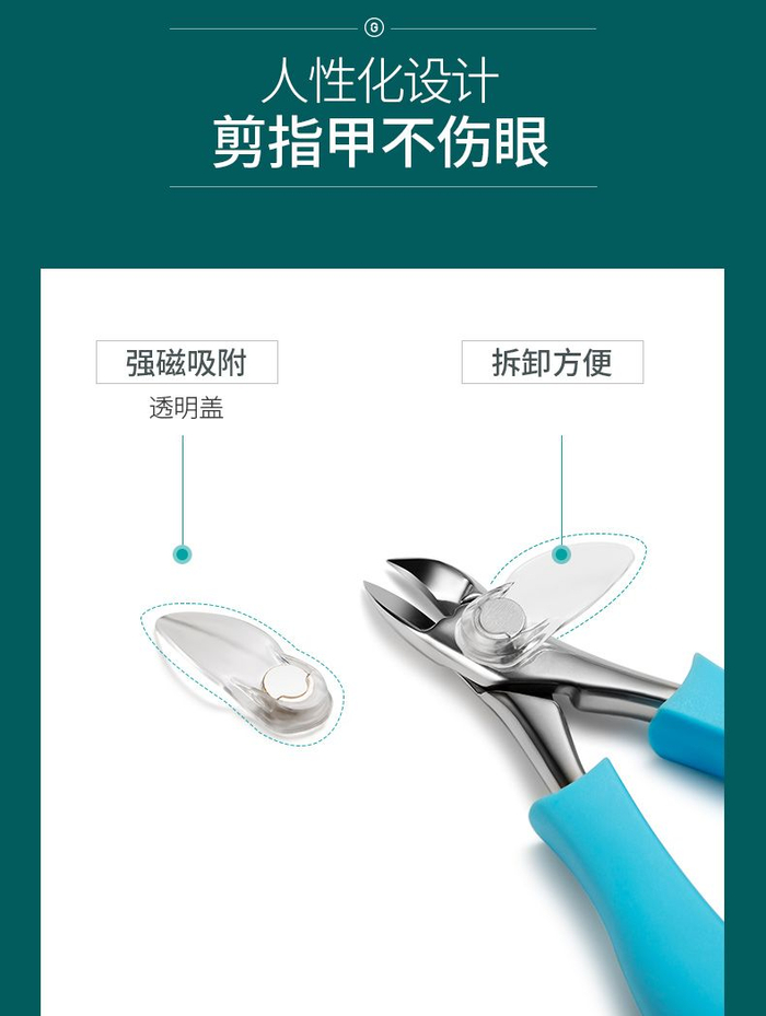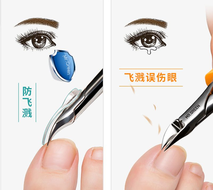 市面上售卖的很多甲沟钳,在使用过程中特别容易被飞溅的残甲伤到眼睛,针对这一现象,MR.GREEN甲沟钳配备了防飞溅透明盖。