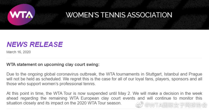16日晚,WTA官方发布声明宣布巡回赛将暂停至5月2日。斯图加特站、伊斯坦布尔站和布拉格站取消后,其他几站欧洲红土赛事是否会延期或取消还要继续做评估。