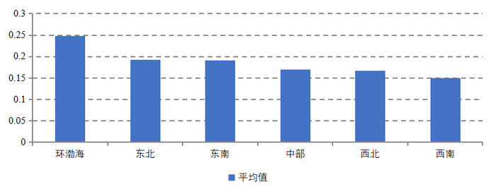 将286个城市划分为六大区域(见图4),按照六区域城市医疗硬件环境指标均值排序,从高至低依次为:环渤海、东北、东南、中部、西北和西南。呈现东中西总体趋势,但又与经济发展略有背离,经济发达的东南屈居相对落后的环渤海和东北,西南经济比较活跃但医疗环境却在最后。总体差距不大,可以分成四级:最大环渤海接近0.25,东北东南在0.19上下,中部西北在0.16-0.17之间,西南地区在0.15。