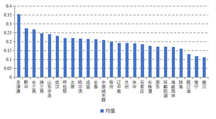 观察各城市群医疗硬件环境竞争力指数均值可知(见图5),
