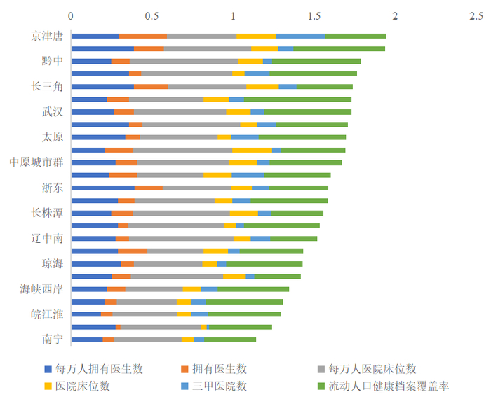 图6 各城市群医疗硬件环境竞争力分项指标对比