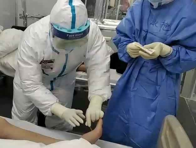 “这是一根经过改造的针灸针,‘秘密’就在这层一次性套管上。”医疗队队长樊民颇为自豪地说到,“在隔离病房里,医生都穿着防护服,戴着护目镜、口罩、手套。护目镜很容易起雾,戴着几层手套,进针时手感会比较差,还容易误伤自己。”