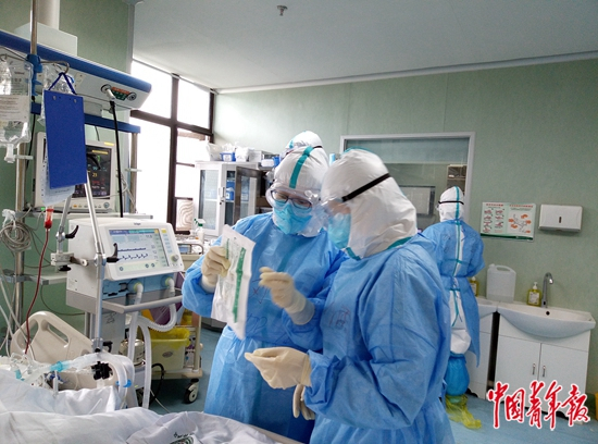 刚开始,医护人手不够,刘阳和同事值24小时班,除了吃饭,没有空闲。他们尽量不喝水,不上厕所,就这样支撑了17天,后援人员到来,情况得以缓解。