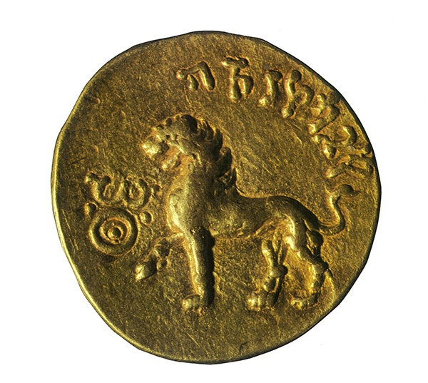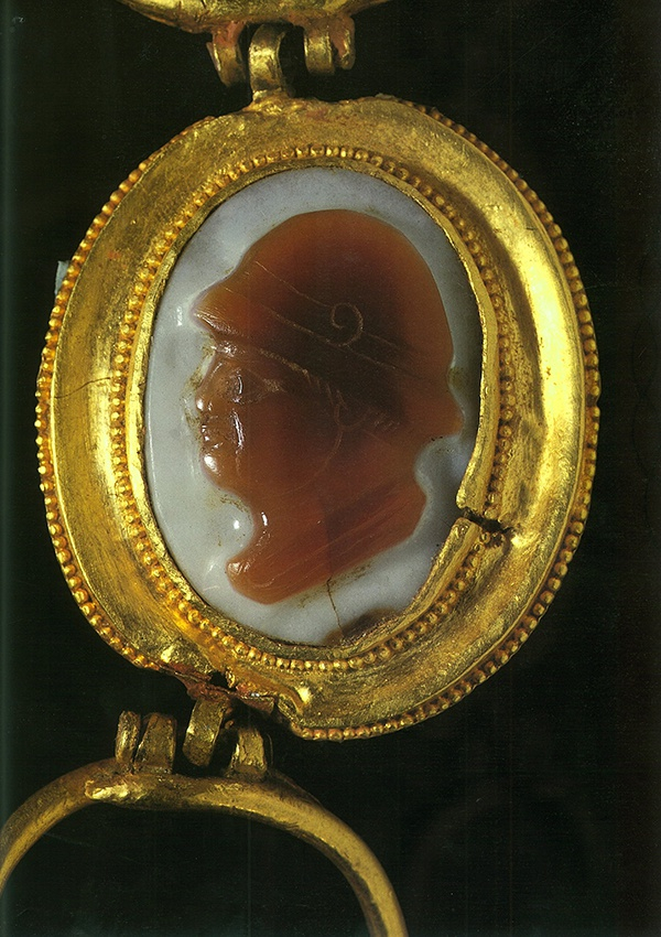 通过此考古报告集,我们可以看到公元前后的阿富汗北部(巴克特里亚)是诸多文化汇聚交融的场所,既有具有草原塞种特色的金饰,又有希腊化中亚所具有的希腊式吊坠,既有印度文化的金币(也有可能是金质徽章),又有汉文化典型器物的汉镜。其中,有些文物所体现的内涵,和传统史料中记载的月氏(贵霜)可以相互印证,如唐初玄奘在《大唐西域记》中追述了这样一个故事:数百年前,贵霜君主迦腻色伽在兴都库什山降伏恶龙时,“两肩起大烟焰”。以往我们认为此故事可能为后世虚构神话,但黄金之丘中,出土了时代比迦腻色伽早100年左右的君主降伏双龙的牌饰。由此可见,在中亚草原,君主降伏恶龙的传说早有原本,只不过后人将其安在了迦腻色伽的身上(图7 降龙金饰)。