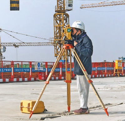 郑州南站施工现场,测量员正在用全站仪进行施工点位测量。