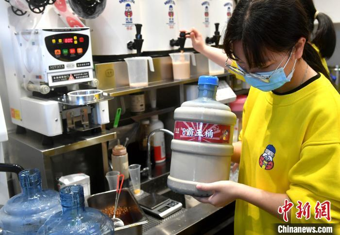 资料图:3月13日,福建省福州市一奶茶店工作人员正在制作5升“霸王桶”奶茶。 吕明 摄