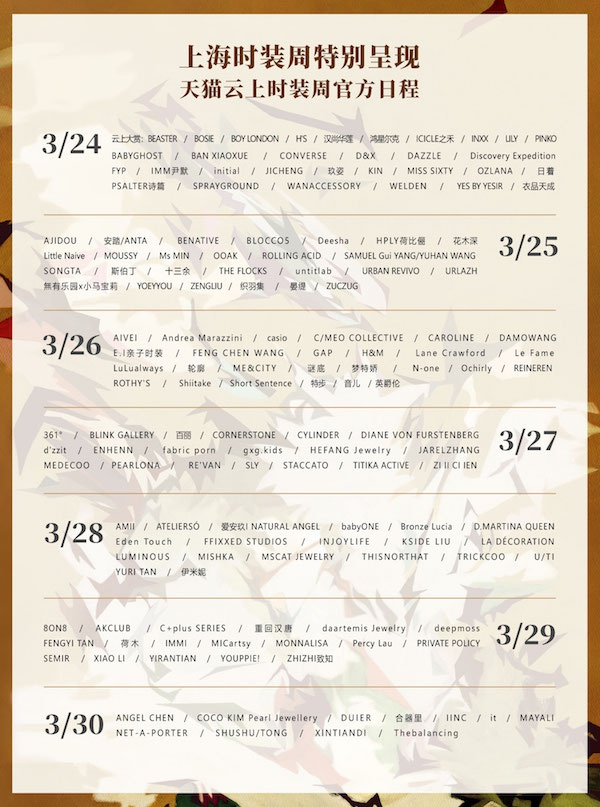 3月18日,上海时装周特别呈现——天猫云上时装周新闻发布会首次以视频直播形式在线举行,宣布了这个消息。3月24日至30日,150场线上发布将集结亮相云端,消费者可通过“云走秀+云直播+云逛店”的独特形式展示新款设计。