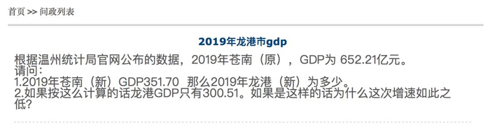 上述数据从何而来?城叔梳理发现,“2019年苍南(原)GDP为652.21亿元”,来自温州市统计局2月18日公布的全市生产总值(2019年4季度)报告。而“2019年苍南(新)GDP351.70亿元”,则是3月10日苍南县统计局针对另一则网友问政的答复内容。