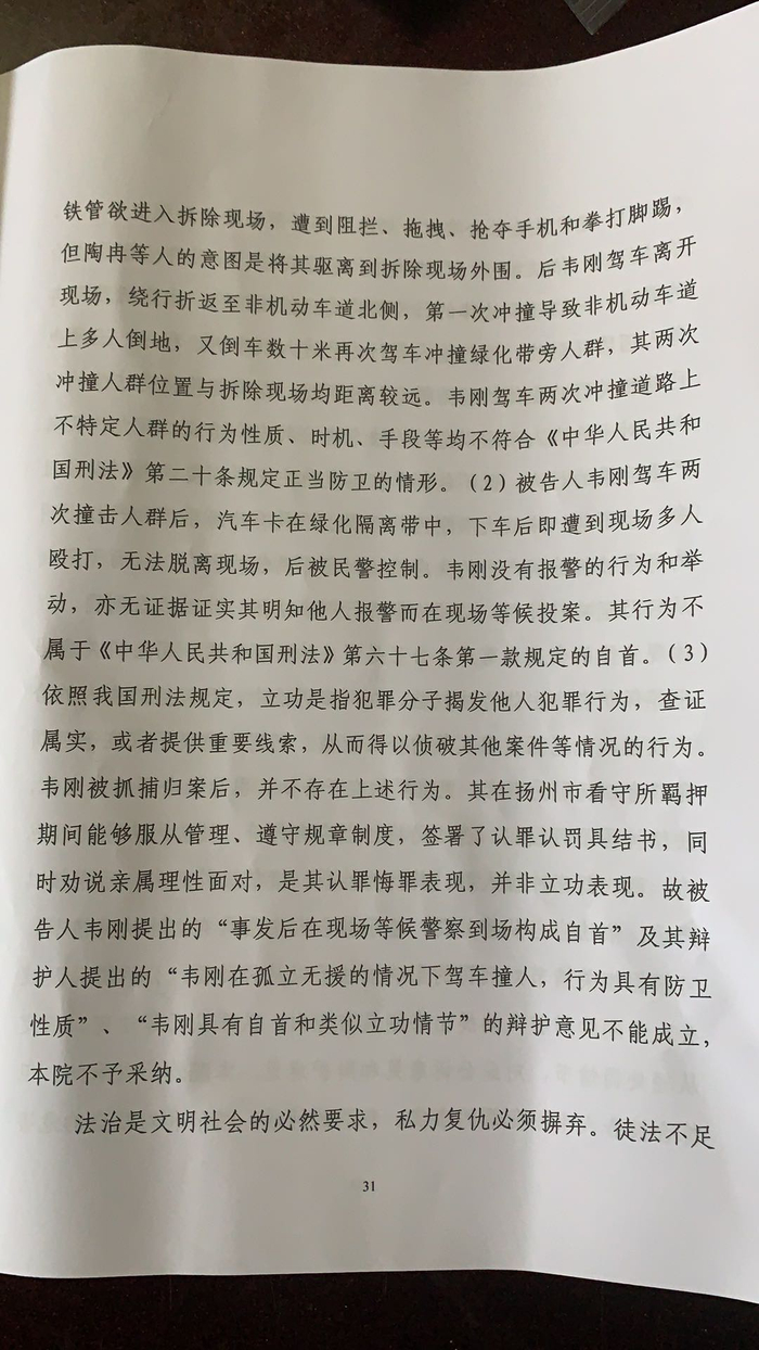 这起发生在2018年10月“牙刷之都”扬州市杭集镇上的撞人血案,由强拆引发,最终导致两死九伤的惨剧。今年3月16日下午,经扬州市中级法院审理,韦刚犯有以危险方法危害公共安全罪,被判处有期徒刑15年,剥夺政治5年。而参与强拆的多人也遭到起诉(尚未开庭审理)。