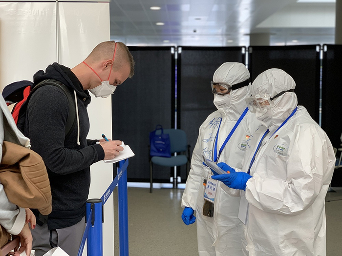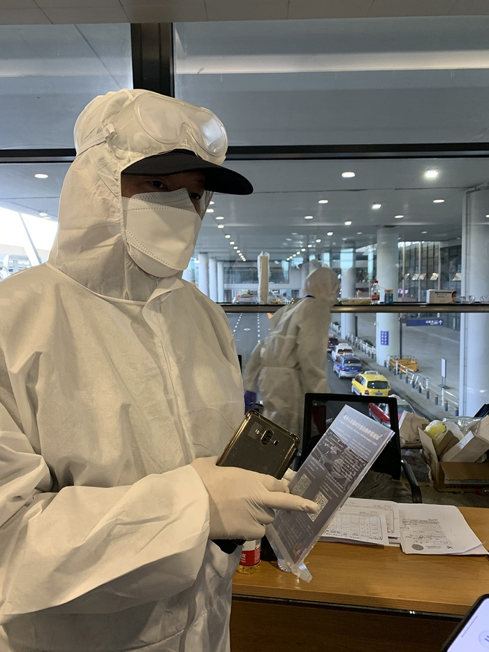 民警定点集中住宿 3月20日中午11点30分,澎湃新闻记者来到浦东国际机场二号航站楼,在入境人员分流的各区“专柜”前,发现黄浦区的几位工作人员正在紧张扒饭,根据往常的经验,浦东机场航班落地的客流高峰将在午后到来。 自疫情防控专项工作部署实施以来,黄浦公安迅速成立了一个由出入境办、特警支队、各派出所搭建的涉外防疫工作专班,来自新天地派出所的李勇是此次黄浦公安驻守机场开展防控工作的负责人。 “兵马未动,粮草先行”,为保障专项工作组民警的安全和健康,黄浦公安在专项工作开始之即,筹备了N95口罩、护目镜、防护服等防疫装备。同时,为了减轻执勤民警来回奔波的辛苦,又最大限度地避免对家属可能形成的传染风险,前端工作民警采取定点集中住宿的管理模式,由警务保障部门为专项工作组配送防疫装备、食品、生活用品等,确保民警无后顾之忧。 李勇告诉记者,目前他们在黄浦的登记柜台上进行前端信息核查,根据警方的后端数据进行核查比对,可以做到及时反馈,有四辆车在浦东机场蹲点守候,然后根据人员到达数以最快的速度送到黄浦区的留验观察点进行核酸检测。黄浦区李勇介绍防疫工作 据黄浦区登记的入境人员数量统计显示,外籍人员和本国人员的比例基本为一比一。根据登记的问答信息,外籍人员入境的主要原因是在沪工作,也有一部分是家属来投奔在沪工作的家人,可能是考虑到海外的疫情形势比较严峻,而目前住在中国更加安全,因而有较多拖家带口的。 同时,自3月13号和3月17号上海先后将美国和英国列入重点国家范围,海外的留学生面对停课以及海外的防疫措施,处境比较艰难,所以选择返回国内,因而近日也有明显的增加。 浦东部分:日均近300名重点国家入境旅客 自3月6日以来,浦东公安分局出入境管理办公室的胡司豪便和同事一起进驻到了浦东国际机场,24小时落实入境人员闭环管理,确保一个不漏。 两张桌子、几把椅子,成了胡司豪和他同事们的战场。这里被称作“集散点”,来自16个区的百余名工作人员,将登记点一字排开,重点国家的入境旅客到达浦东国际机场后,将被引导至此。在对入境旅客的身份信息和居住地信息进行登记核查后,工作人员将派专人、专车进行集中接送。浦东新区进行入境旅客登机 浦东不出意外成了现场最忙碌的登记点,胡司豪告诉记者,平均每天会有近30名来自重点国家的入境旅客来到登记点,其中欧美国家超过3成。 作为出入境办民警,胡司豪熟练掌握英语、俄语两门外语,除了完成对入境旅客的信息登记工作,他做得最多的就是进行语言翻译、流程引导、帮扶求助,从接班上岗,到脱下防护服露出早已被汗水湿透的制服,12小时,登记旅客一波接着一波,不能有片刻懈怠。 “因为现在是特殊时期,需要我们对入境人员进行法律提醒。”胡司豪说,他每天需要不停地进行沟通解释,而14天的日夜坚守,使他的嗓子早已沙哑。在“集散点”的一角摆放着四张折叠椅,累了困了,几个队员可以轮流去躺一会。但大家都很少去休息,胡司豪说自己实在顶不住困了,就站起来走一走。 由于入境客流量大,在浦东新区入境集散地的人员等待时间也相对较长,一位今晨6点落地,在座椅上等待的从英国回来的留学生告诉记者,自己在英国威尔士读书,是个相对“乡下”的地区,那里的大多数居民对于中国留学生戴口罩的情况没有什么歧视,就是有一些青少年会来吓一下人,英国的学校已经停学了,就想回家上网课,回来的时候就想好了要去集中隔离,不给爸妈还有邻居添麻烦。 这位留学生的身旁是浦东新区集散点的一块旅客自助服务区,提供了一大桶的姜汤、饮料以及小饼干。 “Of course,it is difficult for all of us, the people are trying their best,the people are very nice here. ”(显然当下的一切对所有人都很难,但现场的工作人员已经尽了最大的努力,他们都非常友善)一对带着孩子从德国入沪,长期在浦东生活工作的夫妇这样说到。 自3月1日以来,上海警方已经累计协助检查重点国家来沪航班4百余架次、重点国家来沪人员3万余人,发现重点人员全部送医。 一位长宁分局驻浦东机场值守的民警在背后写下了个性“签名”: 但使申城飞将在, 不教病毒度沪关。一位长宁分局驻浦东机场值守的民警在背后写下了个性“签名”。