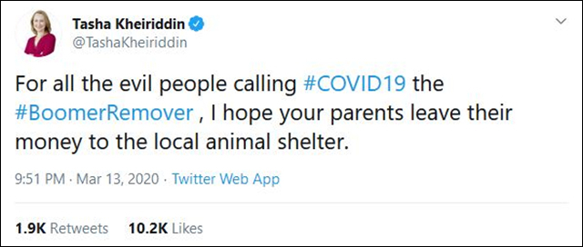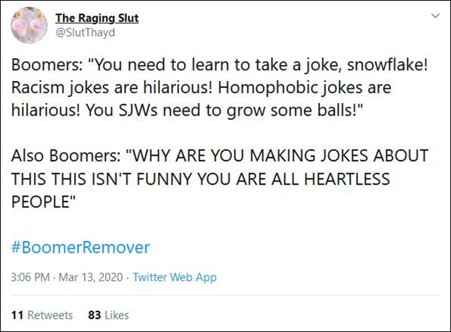 更让人不可思议的是,疫情之下,西方社会的年轻群体中出现了一种格外叛逆的声音,称新冠病毒是“老人消灭者”(Boomer Remover),“#Boomer Remover”的标签一度也在推特上成为热门话题。