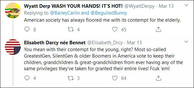 “美国社会对老人的蔑视总能折服我。”“你指的应该是对年轻人的蔑视才对吧?绝大多数所谓最伟大的世代(经历一战、二战、大萧条世代的人)、沉默的一代(1920-1940年出生的人)以及婴儿潮一代的美国人,他们投票不让他们的孩子、孙子、曾孙分享他们想当然地享有了一辈子的特权!让他们去死吧!”