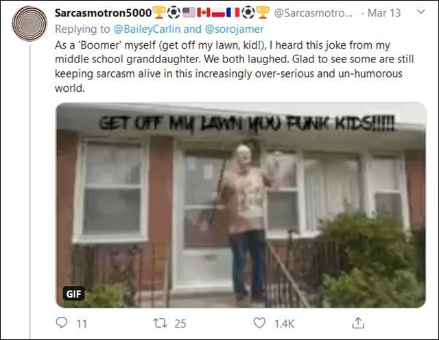 也有老人并不太在乎这个说法,“我自己就是个老人(别踩我的草坪,臭小鬼!),我从上中学的孙女那儿听过这个笑话。我们都笑了。很高兴在这个越来越过度严肃、没有幽默感的世界里,还能听到一些挖苦的声音。”