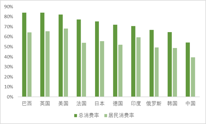 图2:代表性国家的居民消费率和总消费率(2018年)