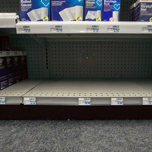 美国加州3月4日宣布全州进入紧急状态。图为洛杉矶一家药店,摆放口罩的货架已经空了。图据新华社