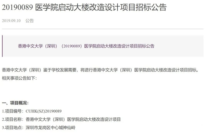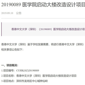 2019年1月,深圳市政府、香港中文大学、香港中文大学(深圳)三方就已签署共建香港中文大学深圳医学院及其附属医院的合作协议,医学院选址位于龙岗神仙湖畔。如今,这所医学院要来了!据港中大(深圳)透露,临床医学专业及药学专业将和正在建设的香港中文大学(深圳)医学院统筹规划,最早将于2021年启动本科招生。值得一提的是,医学院启动大楼改造设计项目招标公告已于2019年9月10日发布。
